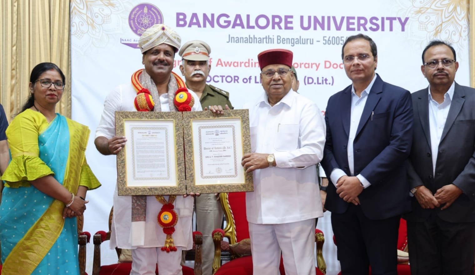 ಬೆಂಗಳೂರು: ಬೆಂಗಳೂರು ವಿಶ್ವವಿದ್ಯಾಲಯದ ವತಿಯಿಂದ 60ನೇ ಘಟಿಕೋತ್ಸವದ ಅಂಗವಾಗಿ ವಿಧಾನಸಭಾ ಸ್ಪೀಕರ್ ಯು. ಟಿ. ಖಾದರ್ ಅವರಿಗೆ ನೀಡಲಾಗಿರುವ ಡಾಕ್ಟರ್ ಆಫ್ ಲೆಟರ್ಸ್ (ಡಿ.ಲಿಟ್) ಗೌರವ ಪದವಿಯನ್ನು ಬಾಂಕ್ವೆಟ್ ನಡೆದ ಸರಳ ಸಮಾರಂಭದಲ್ಲಿ ರಾಜ್ಯಪಾಲ ಥಾವರ ಚಂದ್ ಗೆಹಲೋತ್ ಪ್ರದಾನ ಮಾಡಿದರು.
